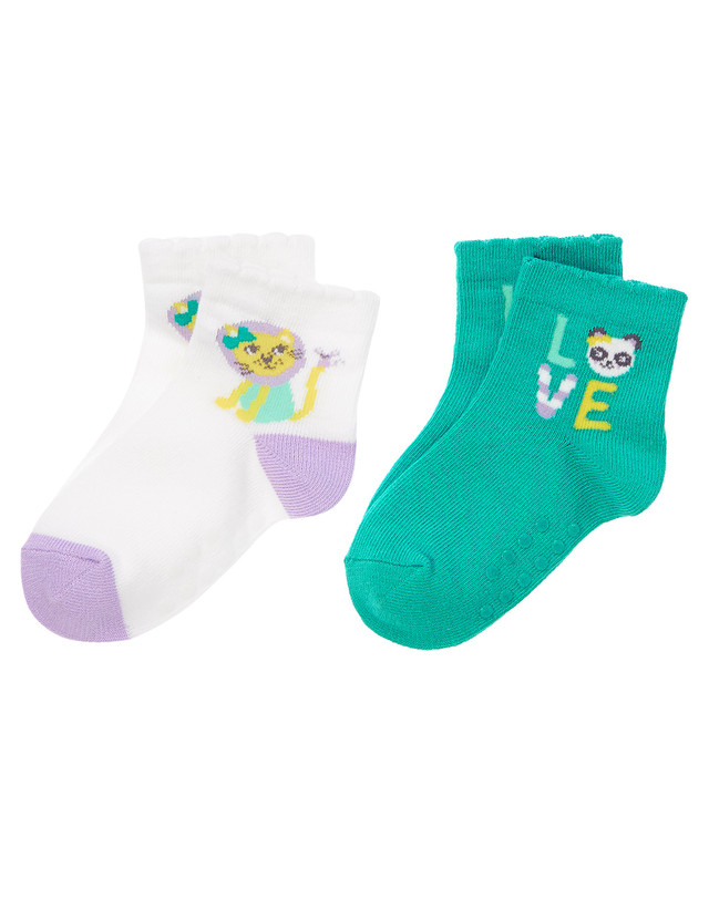 — білі шкарпетки з малюнком левеняти, п'ята та носочок бузкового кольору